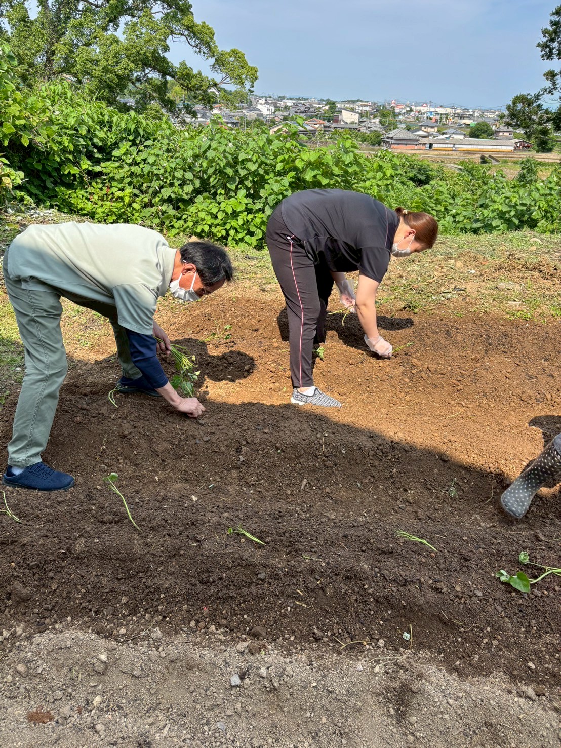 午前中、プランターへの水まきとオクラとマリーゴールドの苗植え、古い土の片づけを行いました