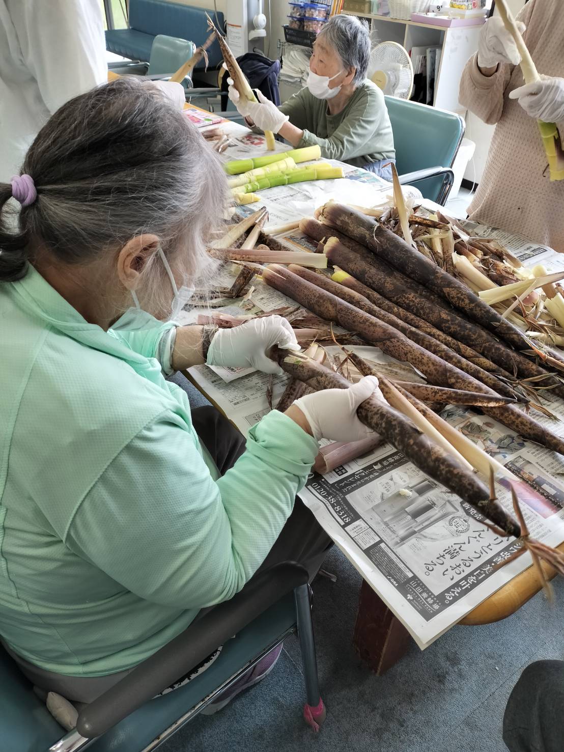 午後からはアジサイの飾りつけに葉っぱを折り紙で作ろうと切ったり折ったりしてもらいました